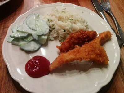 | Hühnersticks | mit Reis und Gurkensalat | edit | del |